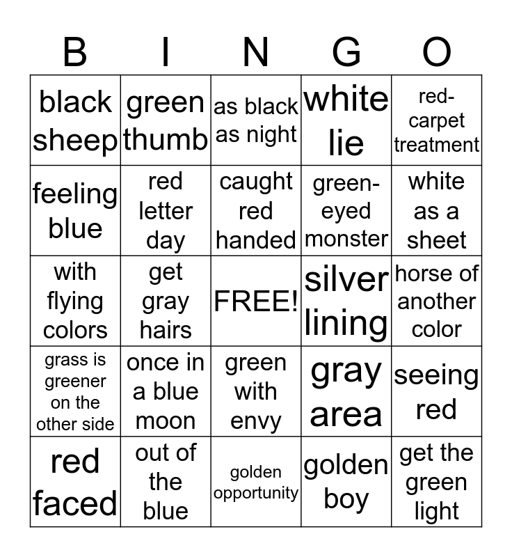 This bingo card has a free space and 24 words: once in a blue moon, out of the blue, caught red handed, red faced, red-carpet treatment, black sheep, feeling blue, green thumb, silver lining, green with envy, green-eyed monster, with flying colors, gray area, seeing red, red letter day, golden boy, horse of another color, as black as night, white as a sheet, get gray hairs, get the green light, grass is greener on the other side, white lie and golden opportunity.