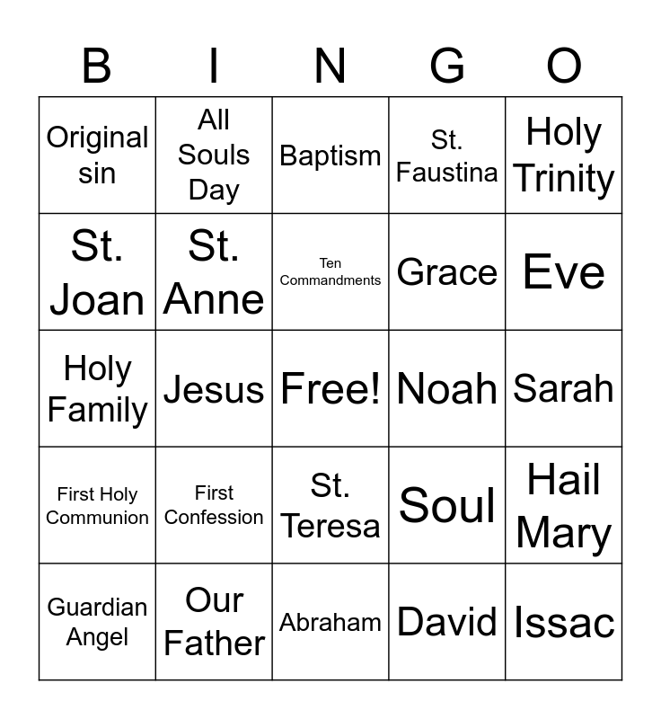 This bingo card has a free space and 30 words: Our Father, Holy Spirit, Jesus, Blessed Virgin Mary, Original sin, Baptism, St. Anne, St. Teresa, Noah, Abraham, Sarah, Issac, David, Adam, Eve, Satan, Soul, First Holy Communion, First Confession, Holy Trinity, Holy Family, All Saints Day, All Souls Day, Grace, St. Joan, St. Faustina, Hail Mary, Guardian Angel, Ten Commandments and Sign of the Cross.