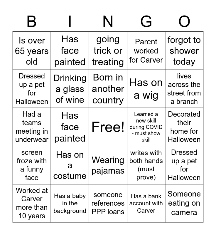 This bingo card has a free space and 29 words: Wearing pajamas, Has a baby in the background, going trick or treating, Has a birthday today, forgot to shower today, Is over 65 years old, Drinking a glass of wine, Born in another country, Learned a new skill during COVID - must show skill, Dressed up a pet for Halloween, Worked at Carver more than 10 years, Has face painted, Has a bank account with Carver, Someone eating on camera, Had a teams meeting in underwear, Kid crashes teams meeting, someone references PPP loans, writes with both hands (must prove), lives across the street from a branch, screen froze with a funny face, Has on a costume, family photo in background, Has on a wig, Decorated their home for Halloween, Dressed up a pet for Halloween, Has face painted, Wearing pajamas, Parent worked for Carver and lives across the street from a branch.