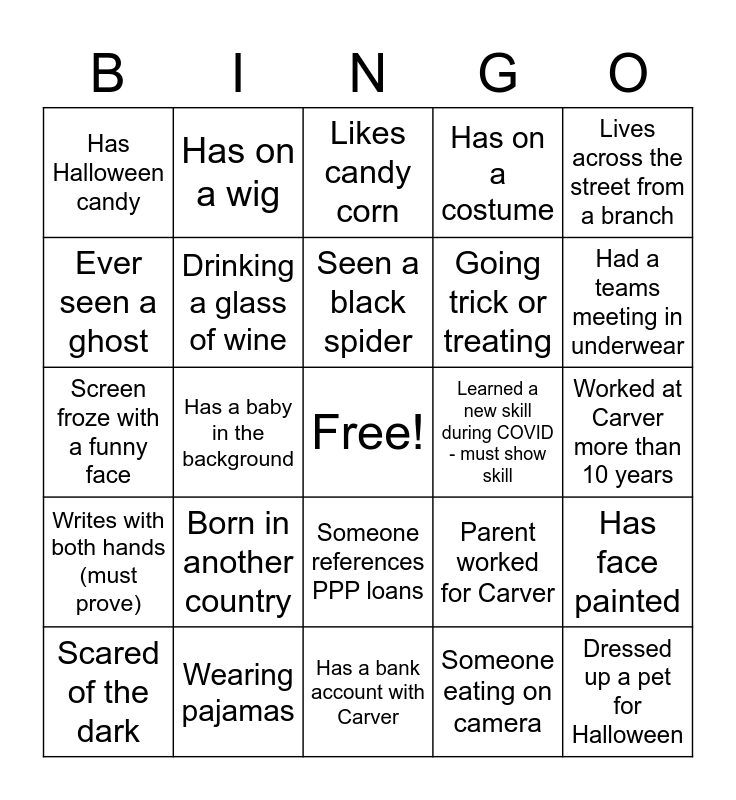 This bingo card has a free space and 29 words: Scared of the dark, Decorated their home for Halloween, Has a baby in the background, Kid crashes teams meeting, Has Halloween candy, Likes candy corn, Drinking a glass of wine, Born in another country, Learned a new skill during COVID - must show skill, Wearing pajamas, Worked at Carver more than 10 years, Dressed up a pet for Halloween, Has a bank account with Carver, Someone eating on camera, Had a teams meeting in underwear, Forgot to shower today, Someone references PPP loans, Writes with both hands (must prove), Lives across the street from a branch, Screen froze with a funny face, Parent worked for Carver, Family photo in background, Going trick or treating, Ever seen a ghost, Has on a costume, Has on a wig, Has face painted, Seen a black spider and Is over 65 yrs old.