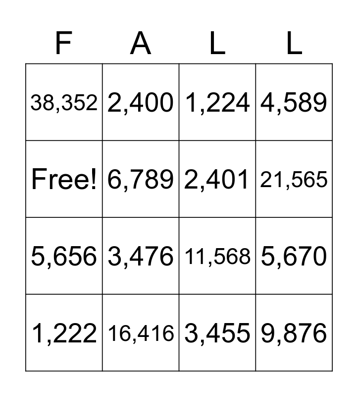 This bingo card has 16 words: 16,416, 5,670, 1,224, 38,352, 5,656, 2,400, 11,568, 3,455, Free!, 6,789, 1,222, 4,589, 3,476, 21,565, 2,401 and 9,876.