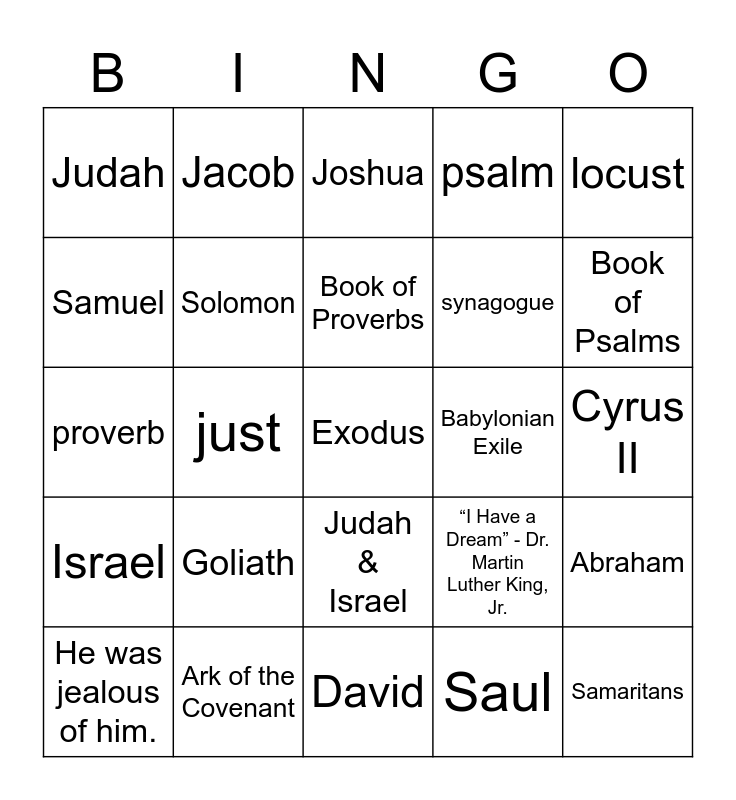 This bingo card has 28 words: Abraham, Sarah, synagogue, Saul, Samuel, Joshua, Jacob, Israel, Babylonian Exile, He was jealous of him., proverb, psalm, Ark of the Covenant, David, Book of Psalms, Jerusalem, Goliath, Solomon, Book of Proverbs, Judah & Israel, Judah, Samaritans, Exodus, just, Cyrus II, “I Have a Dream” - Dr. Martin Luther King, Jr., locust and Pharaoh.
