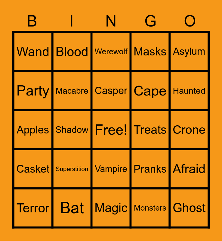 This bingo card has a free space and 105 words: Orange, Coffin, Casper, Cauldron, Cursed, Skeleton, Gravestone, Frightened, Grim Reaper, Jack-O-Lantern, Supernatural, Pitchfork, Cackle, Mummy, Cobwebs, Black Cat, Werewolf, Autumn, Horrible, Frankenstein, Spirit, Bones, Full Moon, Cloak, Flashlights, Superstition, Magic, Cape, Dusk, Phantom, Bat, Eerie, Graveyard, Goblin, Wraith, Banshee, Boogeyman, Warlock, Crone, Casket, Wizard, Vampire, Monsters, Asylum, Whisper, Blood, Festival, Treats, Troll, Terror, Halloween, Fairy, Pranks, Cemetery, Disguise, Scared, Carnival, Enchanted, Spell, Party, Shadow, Undead, Broomstick, Popcorn, Fearful, Midnight, Hexes, Masks, Ghost, Wand, Paranormal, Spider, Zombie, Howling, Eye-Of-Newt, Hobgoblin, Hag, Dark, Crypt, Costumes, Witches, Brew, Masquerade, Haunted, Tomb, Macabre, Tricks, Dreams, Candy, Skull, Fangs, Strange, Owl, Boo, Apples, Ghoul, Sorcery, Hocus-Pocus, Afraid, Mausoleum, Lurking, Creature, Incantation, Spooky and Scream.