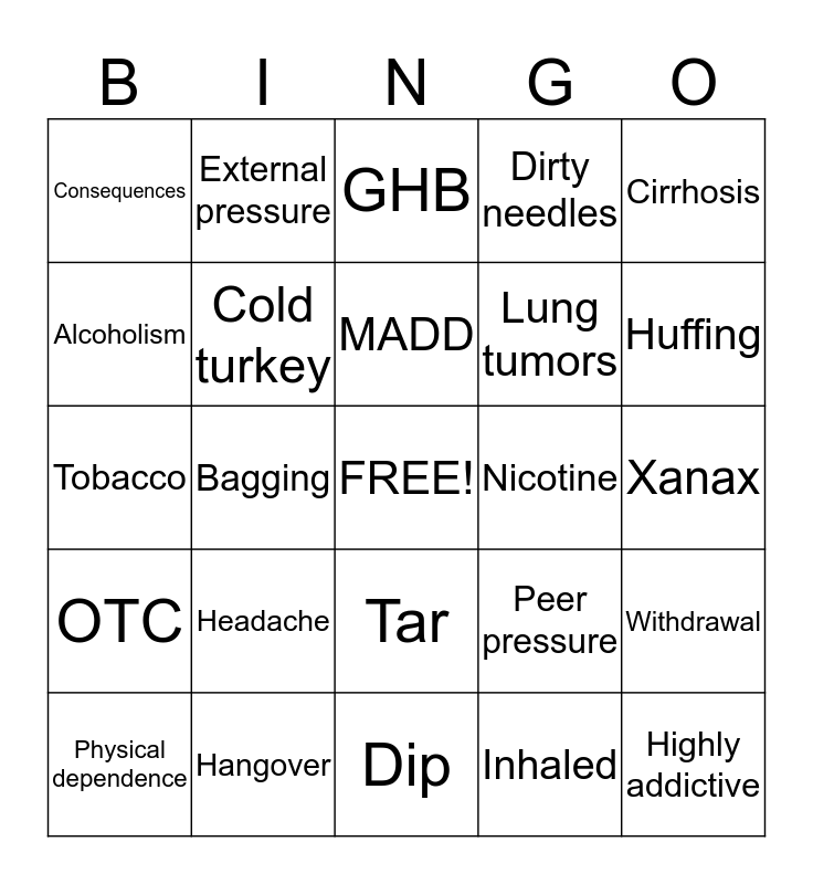 This bingo card has a free space and 24 words: Headache, Hangover, MADD, Physical dependence, Cirrhosis, Consequences, Alcoholism, External pressure, Nicotine, Tar, Lung tumors, Tobacco, Peer pressure, Withdrawal, Cold turkey, Inhaled, Xanax, GHB, Huffing, Bagging, Highly addictive, OTC, Dirty needles and Dip.