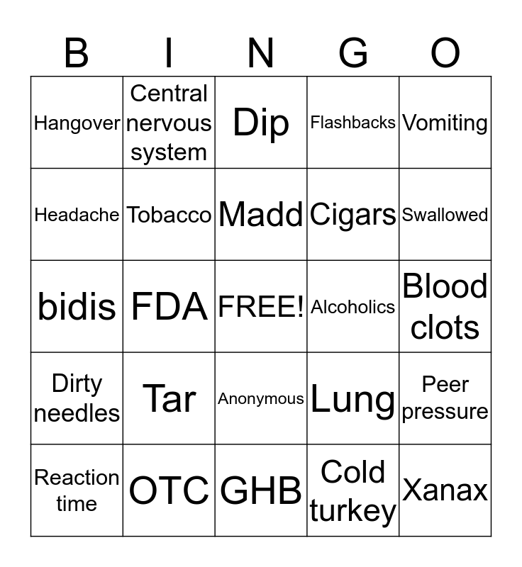 This bingo card has a free space and 24 words: Tar, OTC, Madd, Reaction time, Vomiting, Hangover, Headache, Central nervous system, Alcoholics, Anonymous, Cigars, bidis, Lung, Peer pressure, Tobacco, Cold turkey, Blood clots, Dip, Swallowed, FDA, Xanax, Dirty needles, Flashbacks and GHB.