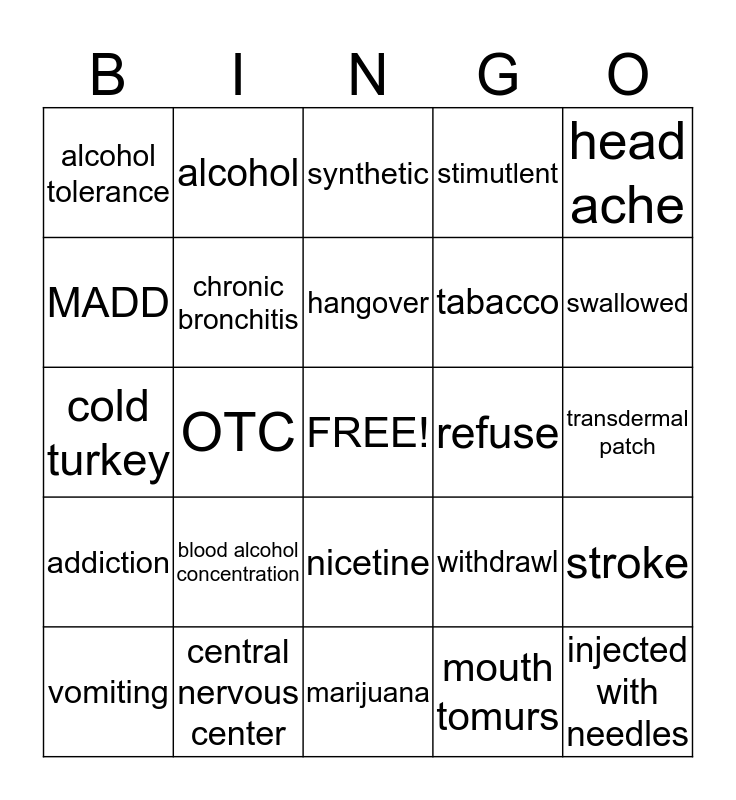 This bingo card has a free space and 24 words: blood alcohol concentration, central nervous center, hangover, vomiting, head ache, alcohol tolerance, MADD, alcohol, refuse, nicetine, tabacco, cold turkey, withdrawl, stroke, chronic bronchitis, mouth tomurs, transdermal patch, synthetic, swallowed, OTC, injected with needles, addiction, stimutlent and marijuana.