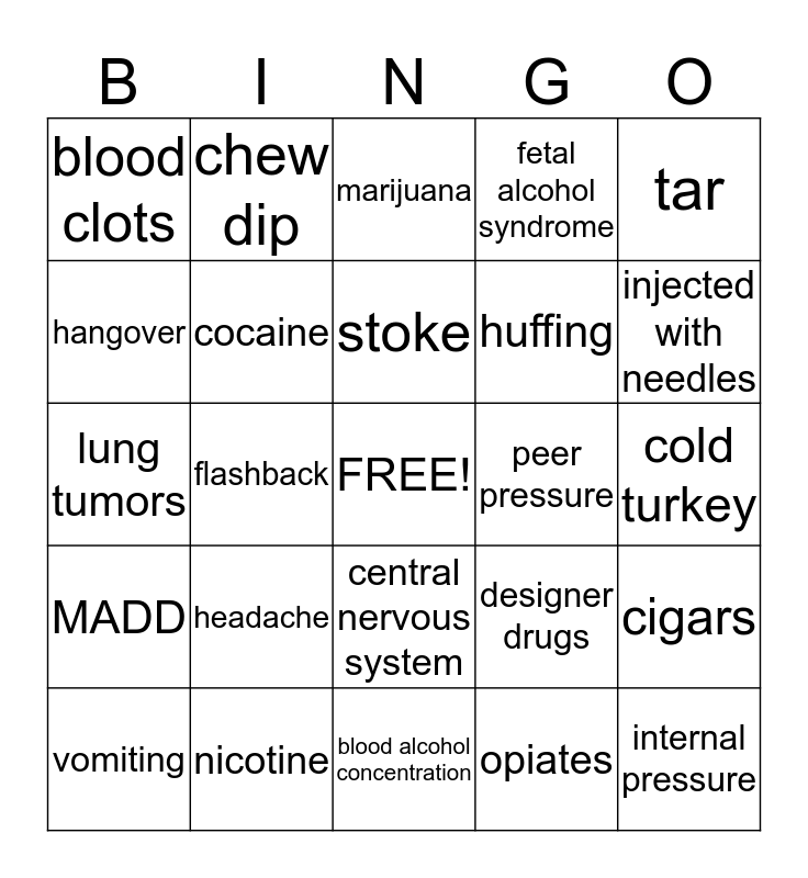 This bingo card has a free space and 24 words: headache, nicotine, stoke, vomiting, tar, blood clots, hangover, chew dip, peer pressure, central nervous system, huffing, lung tumors, designer drugs, cigars, cocaine, opiates, cold turkey, marijuana, injected with needles, flashback, internal pressure, MADD, fetal alcohol syndrome and blood alcohol concentration.
