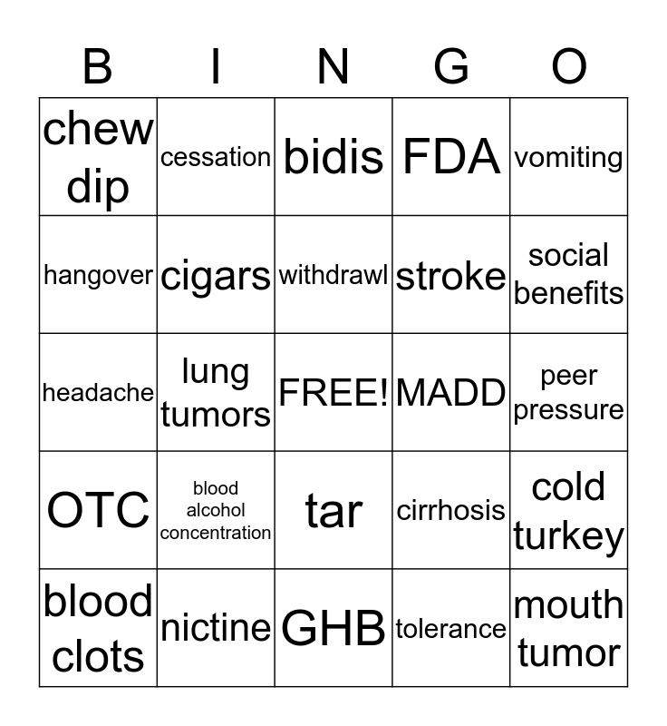 This bingo card has a free space and 24 words: blood alcohol concentration, nictine, withdrawl, blood clots, vomiting, chew dip, hangover, cessation, MADD, tar, stroke, headache, cirrhosis, cold turkey, cigars, tolerance, peer pressure, bidis, social benefits, lung tumors, mouth tumor, OTC, FDA and GHB.