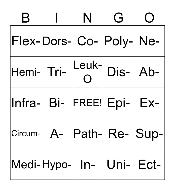 This bingo card has a free space and 24 words: A-, Hypo-, Leuk-O, Medi-, Ne-, Flex-, Hemi-, Dors-, Epi-, Path-, Dis-, Infra-, Re-, Sup-, Tri-, Uni-, Ex-, Co-, Ab-, Bi-, Ect-, Circum-, Poly- and In-.