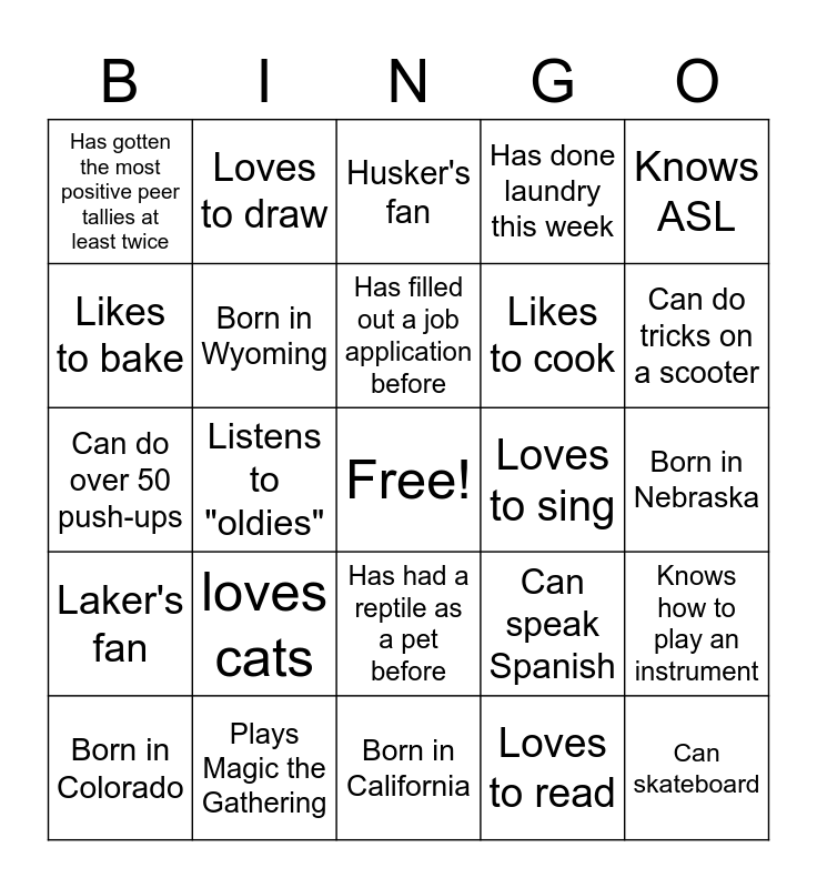 This bingo card has a free space and 29 words: Born in Colorado, Likes to play basketball, Listens to "oldies", loves dogs, Has gotten the most positive peer tallies at least twice, Husker's fan, Born in Wyoming, loves cats, Loves to sing, Plays Magic the Gathering, Born in Nebraska, Can skateboard, Born in California, Loves to read, Can do tricks on a scooter, Likes to play Rugby, Has had a reptile as a pet before, Laker's fan, Knows ASL, Can do over 50 push-ups, Can speak Spanish, Has gotten something from the PIP store, Likes to cook, Likes to bake, Has done laundry this week, Loves to draw, Knows how to play an instrument, Has filled out a job application before and Has written raps before.