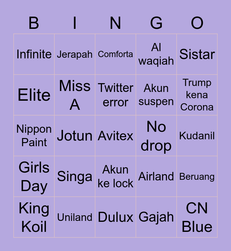 This bingo card has 25 words: Singa, Dulux, Twitter error, King Koil, Sistar, Infinite, Elite, Jerapah, No drop, Akun ke lock, Akun suspen, Nippon Paint, Airland, Beruang, Miss A, CN Blue, Kudanil, Comforta, Trump kena Corona, Jotun, Avitex, Uniland, Girls Day, Al waqiah and Gajah.