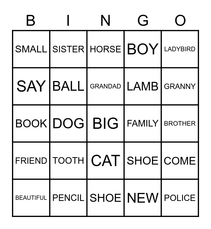 This bingo card has a free space and 24 words: TOOTH, PENCIL, GRANDAD, BEAUTIFUL, LADYBIRD, SMALL, SAY, SISTER, FAMILY, CAT, LAMB, BOOK, SHOE, COME, BALL, NEW, BROTHER, HORSE, GRANNY, DOG, POLICE, FRIEND, BOY and SHOE.