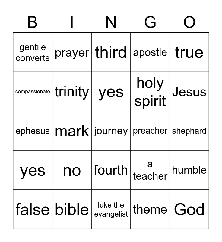 This bingo card has 25 words: no, luke the evangelist, yes, false, true, gentile converts, compassionate, prayer, preacher, fourth, holy spirit, ephesus, a teacher, humble, trinity, God, shephard, third, Jesus, mark, journey, bible, yes, apostle and theme.