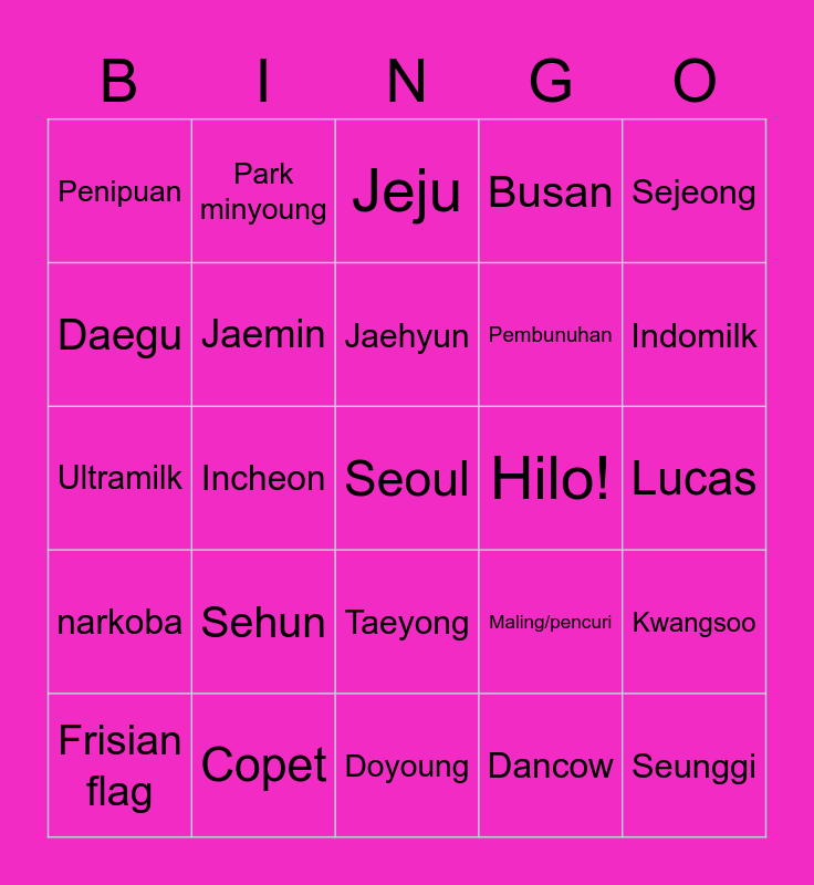 This bingo card has a free space and 24 words: Sehun, Copet, Jaehyun, Frisian flag, Sejeong, Penipuan, Daegu, Park minyoung, Hilo!, Taeyong, Pembunuhan, Ultramilk, Maling/pencuri, Kwangsoo, Jaemin, Dancow, Lucas, Jeju, Indomilk, Incheon, Seunggi, narkoba, Busan and Doyoung.