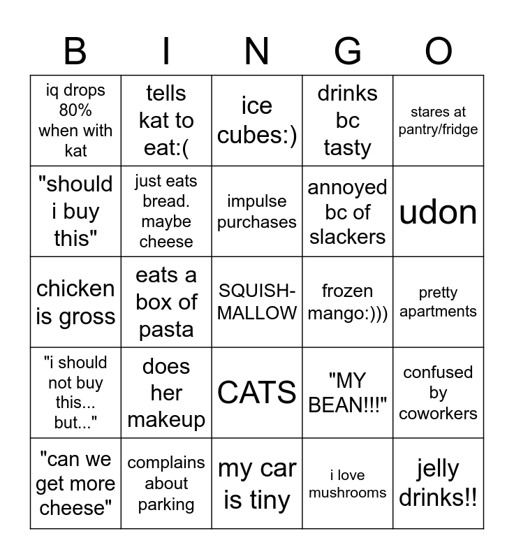 This bingo card has a free space and 24 words: does her makeup, complains about parking, impulse purchases, "can we get more cheese", stares at pantry/fridge, iq drops 80% when with kat, "should i buy this", tells kat to eat:(, frozen mango:))), CATS, annoyed bc of slackers, chicken is gross, "MY BEAN!!!", confused by coworkers, just eats bread. maybe cheese, i love mushrooms, pretty apartments, ice cubes:), udon, eats a box of pasta, jelly drinks!!, "i should not buy this... but...", drinks bc tasty and my car is tiny.