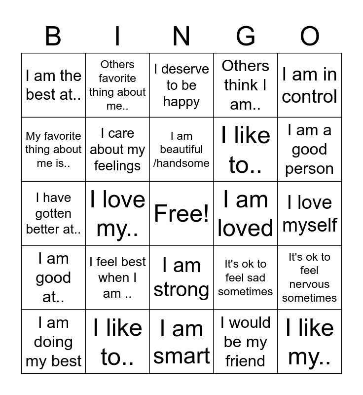 This bingo card has a free space and 25 words: I feel best when I am .., I am smart, I am beautiful /handsome, I am doing my best, I am in control, I am the best at.., My favorite thing about me is.., Others favorite thing about me.., I am loved, I am strong, I like to.., I have gotten better at.., It's ok to feel sad sometimes, It's ok to feel nervous sometimes, I care about my feelings, I have people who care about me, I love myself, I deserve to be happy, I am a good person, I love my.., I like my.., I like to.., I am good at.., Others think I am.. and I would be my friend.