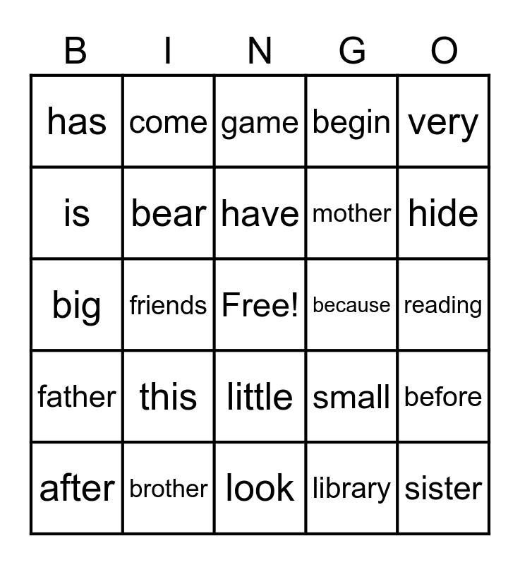 This bingo card has a free space and 25 words: this, look, have, after, very, has, is, come, because, little, mother, big, small, before, bear, school, reading, game, hide, friends, sister, brother, father, begin and library.