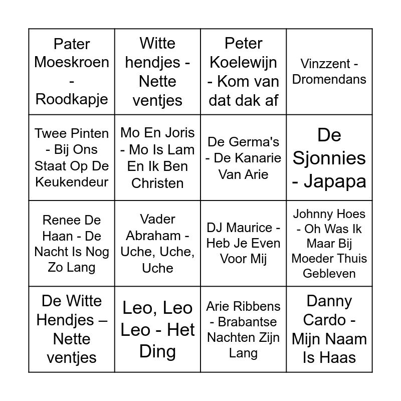 This bingo card has 68 words: De Deurzakkers - Het Feest Kan Beginnen, De Witte Hendjes – Nette ventjes, Arie Ribbens - Polonaise Hollandaise, Guus Meeuwis En Vagant - t Dondert En 't Bliksemt, Van Alles We - En Nou Die Hendjes In De Lucht, Zangeres Zonder Naam - Mexico, Witte hendjes - Nette ventjes, Pater Moeskroen - Hela Hola, De Sjonnies - Japapa, Kleintje Pils - Malle Babbe, Imca Marina - Hava Nagila Party, Gerard Joling - Zing met me mee, Arie Ribbens - Brabantse Nachten Zijn Lang, Twee Pinten - Bij Ons Staat Op De Keukendeur, Hanny - Maar Vanavond Heb Ik Hoofdpijn, Mo En Joris - Mo Is Lam En Ik Ben Christen, Johnny Hoes - Oh Was Ik Maar Bij Moeder Thuis Gebleven, Pater Moeskroen - Roodkapje, DJ Cor - Hee Hoo 2008, Rob Ronalds - Bossie Rode Rozen, Renee De Haan - De Nacht Is Nog Zo Lang, Cocktail Trio - Kangoeroe Eiland, Danny Cardo - Mijn Naam Is Haas, Dario - Pappie Loop Toch Niet Zo Snel, Franky Boy - Kontebonke, Hanny - Liefde Is Lekker Maar Lekker Is Niet Altijd Liefde, Tony Bass - Ik Ben Met Jou Niet Getrouwd, Zangeres Zonder Naam - Keetje Tippel, One Two Trio - Jan Klaassen De Trompetter, Gerard Joling - Liefde op het eerste gezicht, Peter Koelewijn - Kom van dat dak af, De Electronica's - De Vogeltjesdans, Guus Meeuwis En Vagant - Per Spoor (Kedeng Kedeng), Riny Van Der Lee - Varkens, Geiten, Boerenkool, Vinzzent - Dromendans, Dennie Christian - Wij Zijn Twee Vrienden, Marianne Weber - In De Hemel, Johnny En Rijk - De Bostella, Vader Abraham - Uche, Uche, Uche, DJ Maurice - Heb Je Even Voor Mij, Havenzangers - Schudden (Zak maar lekker door), Peter Beense - Verdomd alleen (Single Edit), De Germa's - De Kanarie Van Arie, Hydra - Bokkie Bokkie Beh, Ria Valk - De Liefde Van De Man Gaat Door De Maag, Twee Pinten - Onze Ouwe Sint Jan, Leo Nardell - Ik Heb De Hele Nacht Liggen Dromen, US - Schijt aan de buren, Leo, Leo Leo - Het Ding, Dolf Brouwers - Tulpen Uit De Tuin, De Stipkes - Unne Spijker In Munne Kop, Ronnie Bierman - Lou D'r Ligt Een Lijster In De La, Bolle Jan En Mien - Kleine Blonde Mariandel, DJ Arnoud En DJ Jasper - In De Rij, Annie - Annie, Hou Jij Me Tassie Effe Vast, Albert Mol - Het Knakworstenlied, Barry Badpak - Kamelenteen, Jordy Van Loon - Verliefdheid, Manke Nelis - Kleine Jodeljongen, De Deurzakkers - Volle Kracht Vooruit, De Jantjes - Toedeloe, Johnny En Rijk - Vaders Fanfare, Gerard Hoebe - Maar Wie Holt Van Mekaar, Jacky Van Dam - Ik Ben Japie De Portier, Jan Boezeroen - Vondel Was Goed, Peter Koelewijn - Angeline, Frans Bauer - 'N Ons Geluk and Gebroeders ko- waterscooter.
