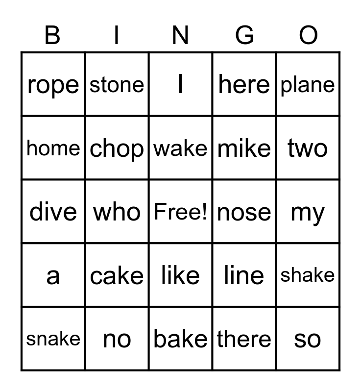 This bingo card has a free space and 25 words: cake, bake, wake, snake, plane, rope, home, stone, nose, like, mike, dive, line, shake, chop, by, my, I, two, who, so, no, a, here and there.