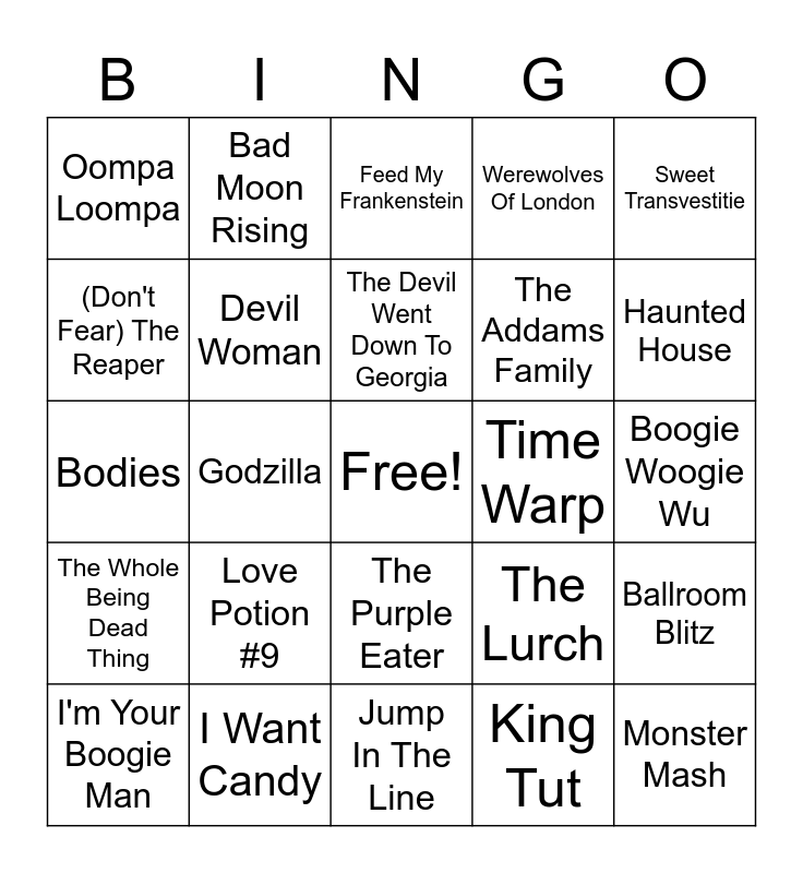 This bingo card has a free space and 50 words: Banana Boat (Day-O), Monster Mash, The Twilight Zone Theme, Jump In The Line, Love Potion #9, Killer Queen, Bad Moon Rising, Evil Woman, (Don't Fear) The Reaper, Black magic Woman, Devil Woman, Werewolves Of London, Ballroom Blitz, The Lurch, (Ghost) Riders In The Sky, People Are Strange, The Devil Went Down To Georgia, Time Warp, Ghostbuster, Sweet Transvestitie, Godzilla, King Tut, Oompa Loompa, The Addams Family, The Munsters, Spooky, Haunted House, Thriller, Feed My Frankenstein, The Purple Eater, Ribolflavin Flavored Non Carbonated Blood, Pet Semetary, On Our Own, This Is Halloween, I Want Candy, Somebody's Watching me, A Nightmare On My Street, Calling All The Monsters, Dead man's Party, Boogie Woogie Wu, Casper The Friendly Ghost, Addams Groove, Bark At The Moon, The Phantom Of The Opera, I'm Your Boogie Man, Bodies, Somebody's knockin', Witch Doctor, The Whole Being Dead Thing and Say My Name.