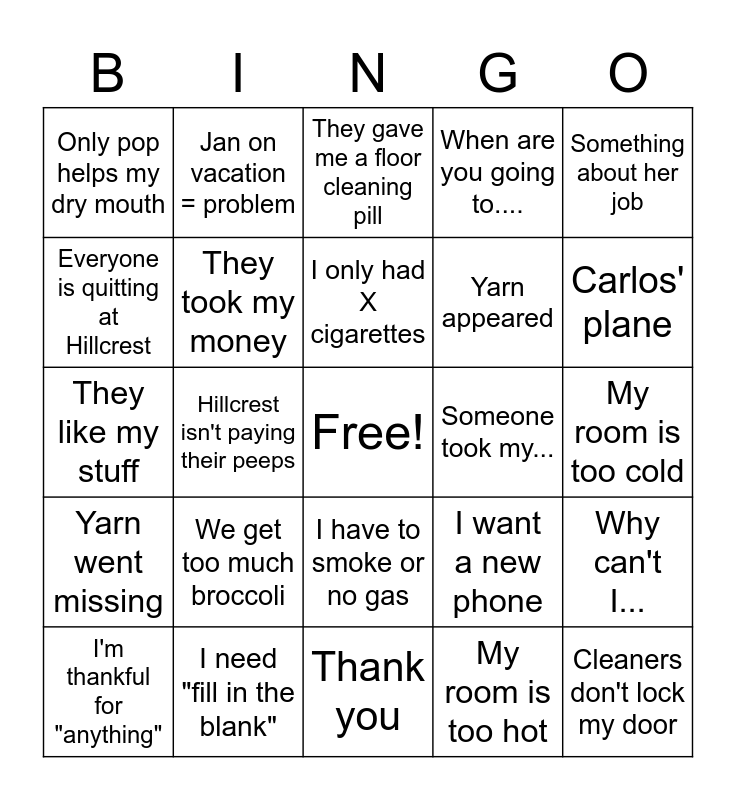 This bingo card has a free space and 24 words: We get too much broccoli, I need "fill in the blank", I only had X cigarettes, I'm thankful for "anything", Something about her job, Only pop helps my dry mouth, Everyone is quitting at Hillcrest, Jan on vacation = problem, Someone took my..., I have to smoke or no gas, Yarn appeared, They like my stuff, I want a new phone, Why can't I..., They took my money, My room is too hot, My room is too cold, They gave me a floor cleaning pill, Carlos' plane, Hillcrest isn't paying their peeps, Cleaners don't lock my door, Yarn went missing, When are you going to.... and Thank you.