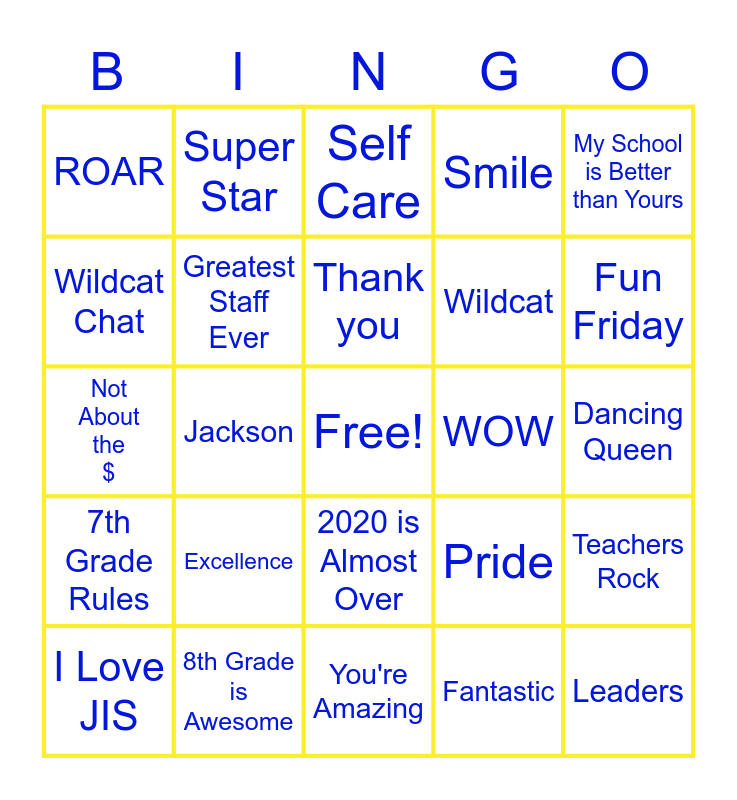 This bingo card has a free space and 29 words: I Love JIS, I Love my Job, Jackson, Resilience, ROAR, Self Care, Greatest Staff Ever, Excellence, WOW, 8th Grade is Awesome, Dancing Queen, Leaders, You're Amazing, Fantastic, Fun Friday, #Goals, 2020 is Almost Over, 7th Grade Rules, My School is Better than Yours, Not About the $, Pride, We Appreciate You, Wildcat, Wildcat Chat, Smile, Super Star, Teachers Rock, Thank you and Tradition.