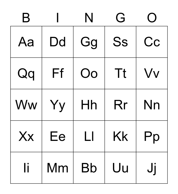 This bingo card has a free space and 24 words: Ee, Mm, Oo, Ii, Cc, Aa, Qq, Dd, Rr, Ll, Tt, Ww, Kk, Pp, Ff, Uu, Nn, Gg, Vv, Yy, Jj, Xx, Ss and Bb.