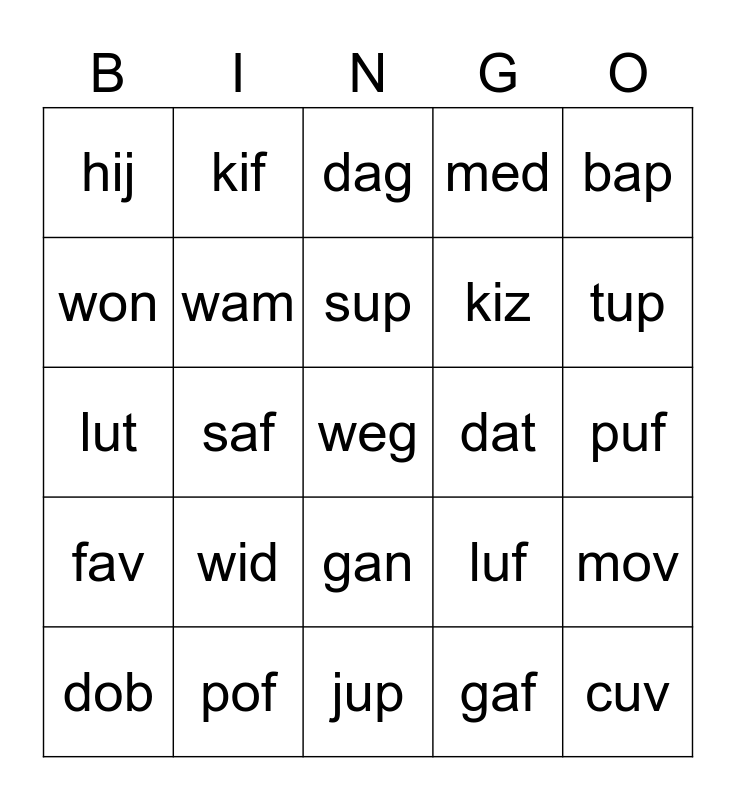 This bingo card has a free space and 24 words: wid, pof, sup, dob, bap, hij, won, kif, dat, gan, kiz, lut, luf, mov, wam, gaf, puf, dag, tup, saf, cuv, fav, med and jup.