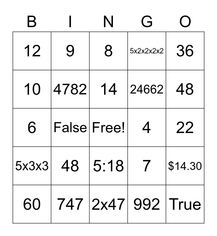 This bingo card has a free space and 24 words: 48, 747, 14, 60, 36, 12, 10, 9, 4, 5:18, 24662, 6, 7, $14.30, 4782, 992, 22, 8, 48, False, True, 5x3x3, 5x2x2x2x2 and 2x47.