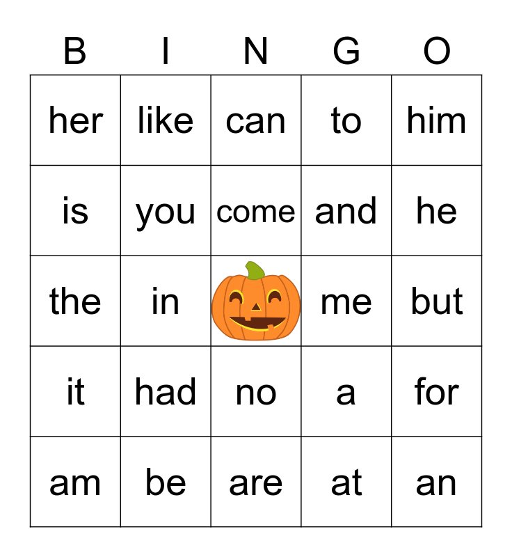 This bingo card has a free space and 24 words: had, be, come, am, him, her, is, like, me, no, and, the, a, for, you, at, but, can, he, in, an, it, to and are.