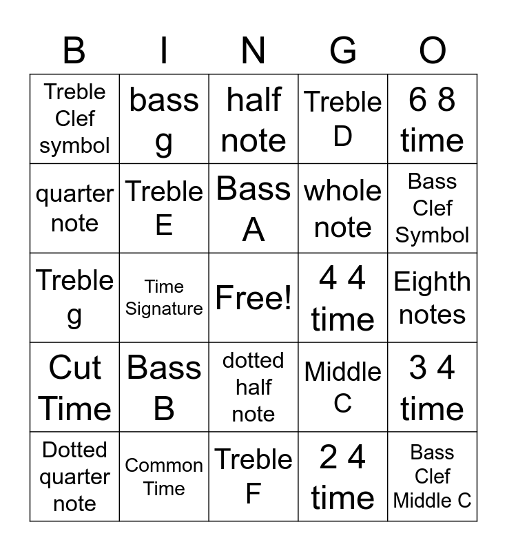 This bingo card has a free space and 24 words: Bass B, Common Time, Bass A, Dotted quarter note, 6 8 time, Treble Clef symbol, quarter note, bass g, 4 4 time, dotted half note, whole note, Treble g, Middle C, 3 4 time, Treble E, 2 4 time, Eighth notes, half note, Bass Clef Symbol, Time Signature, Bass Clef Middle C, Cut Time, Treble D and Treble F.