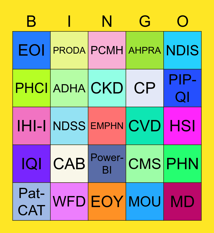 This bingo card has 47 words: SEMPHN, EMPHN, NWMPHN, EOY, CAB, HPOS, PRODA, NASH, PHCI, AnR, ADHA, AHPRA, PHN, CMS, QMS, RACGP, CKD, CVD, T2DM, NDIS, NDSS, MOU, EOI, CP, PDSA, PIP-QI, Pat-CAT, PENCAT, Power-BI, IQI, PO, CQI, PI, BB, SME, WFD, HSI, E&T, GPP, BP, MD, PCMH, IHI-I, IHI-O, NIP, MyHR and JEDI.