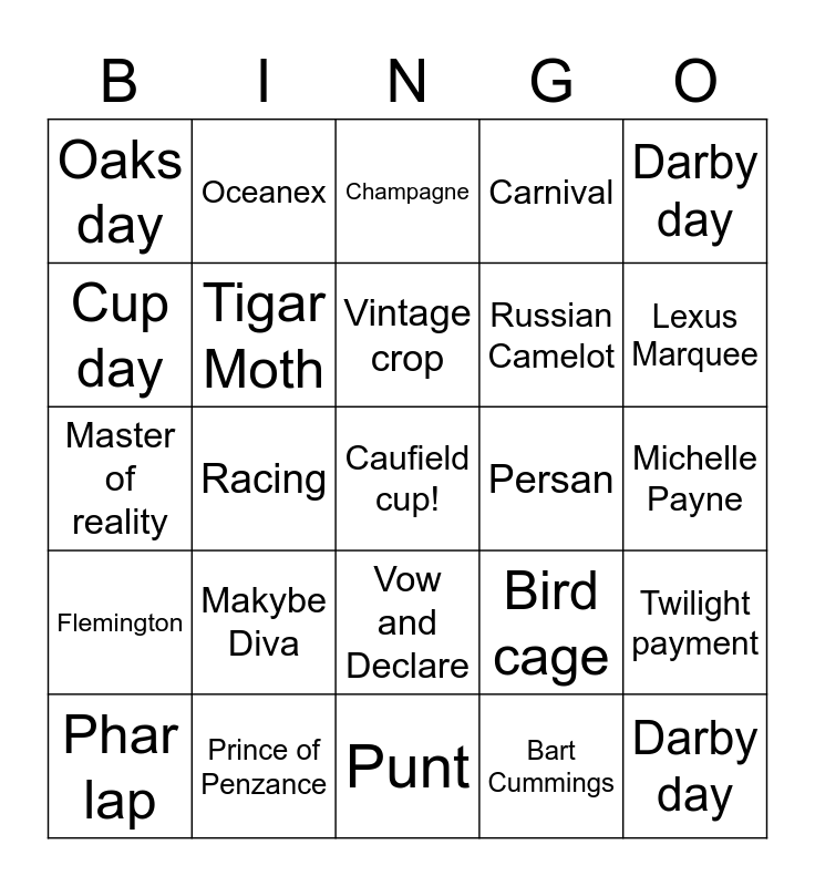 This bingo card has a free space and 24 words: Makybe Diva, Prince of Penzance, Vintage crop, Phar lap, Darby day, Oaks day, Cup day, Oceanex, Persan, Vow and Declare, Russian Camelot, Master of reality, Bird cage, Twilight payment, Tigar Moth, Bart Cummings, Michelle Payne, Champagne, Lexus Marquee, Racing, Darby day, Flemington, Carnival and Punt.