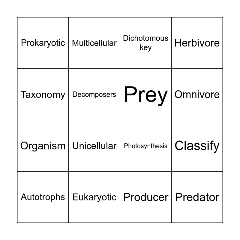 This bingo card has 20 words: Classify, Kingdom, Dichotomous key, Taxonomists, Autotrophs, Taxonomy, Eukaryotic, Prokaryotic, Organism, Multicellular, Unicellular, Photosynthesis, Decomposers, Predator, Prey, Carnivore, Omnivore, Herbivore, Producer and Consumer.