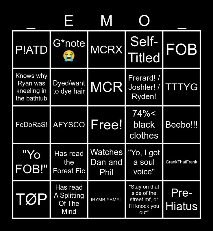 This bingo card has a free space and 24 words: Has read the Forest Fic, Has read A Splitting Of The Mind, MCR, TØP, FOB, P!ATD, Knows why Ryan was kneeling in the bathtub, G*note 😭, 74%< black clothes, Watches Dan and Phil, Frerard! / Joshler! / Ryden!, FeDoRaS!, "Yo, I got a soul voice", CrankThatFrank, Dyed/want to dye hair, "Stay on that side of the street mf, or I'll knock you out", Beebo!!!, MCRX, TTTYG, AFYSCO, Pre-Hiatus, "Yo FOB!", Self-Titled and IBYMB,YBMYL.