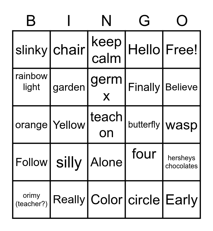 This bingo card has a free space and 24 words: orimy (teacher?), silly, germ x, circle, Free!, slinky, chair, keep calm, butterfly, wasp, orange, garden, four, hersheys chocolates, rainbow light, Really, Color, Hello, Believe, Follow, Yellow, Alone, Finally and Early.