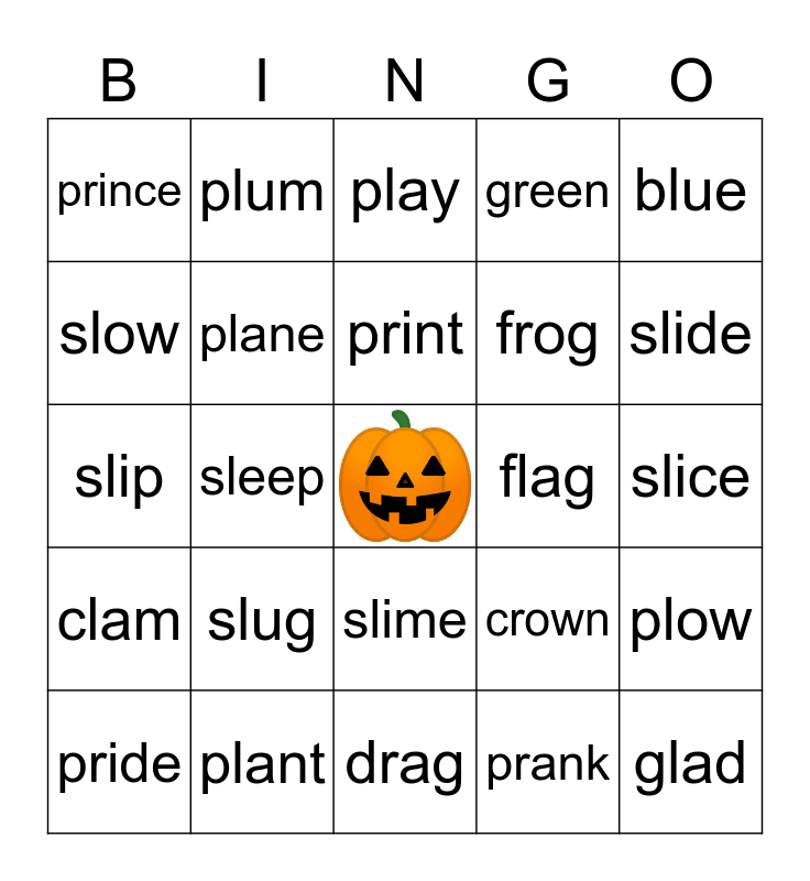 This bingo card has a free space and 24 words: slug, plant, print, pride, blue, prince, slow, plum, flag, slime, frog, slip, crown, plow, plane, prank, slice, play, slide, sleep, glad, clam, green and drag.