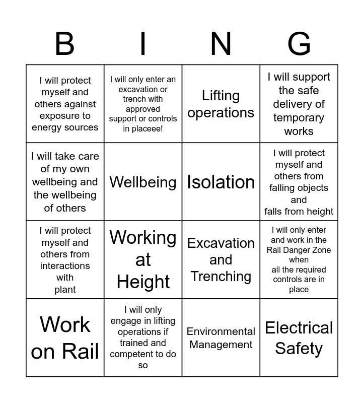 This bingo card has 19 words: Excavation and Trenching, Traffic, Plant and People, Lifting operations, Electrical Safety, I will only enter and work in the Rail Danger Zone when all the required controls are in place, I will take care of my own wellbeing and the wellbeing of others, Environmental Management, I will protect myself and others against exposure to energy sources, I will only enter an excavation or trench with approved support or controls in placeee!, I will protect myself and others from interactions with plant, Working at Height, Wellbeing, Isolation, I will only engage in lifting operations if trained and competent to do so, Work on Rail, Temporary Works, I will support the safe delivery of temporary works, I will protect myself and others from falling objects and falls from height and I will protect myself and others from electrical hazards.