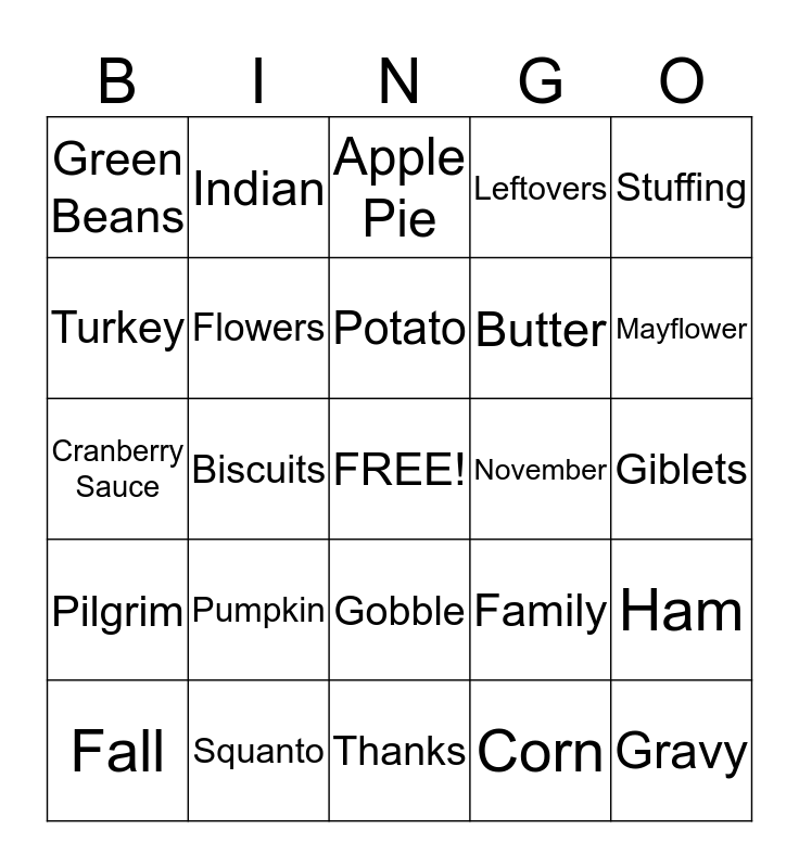 This bingo card has a free space and 24 words: Pumpkin, Squanto, Potato, Fall, Stuffing, Green Beans, Turkey, Indian, November, Gobble, Butter, Cranberry Sauce, Family, Ham, Flowers, Corn, Giblets, Apple Pie, Mayflower, Biscuits, Gravy, Pilgrim, Leftovers and Thanks.