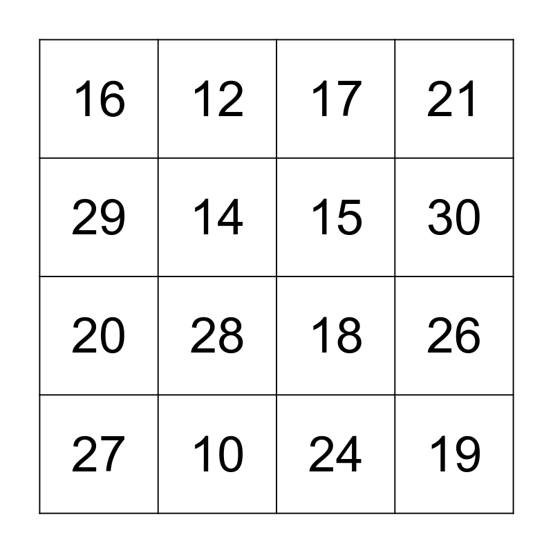 This bingo card has 22 words: 10, 11, 12, 13, 14, 15, 16, 17, 18, 19, 20, 21, 22, 23, 24, 25, 26, 27, 28, 29, 30 and 31.