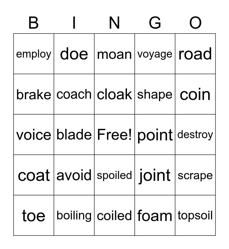 This bingo card has a free space and 34 words: groan, foam, loyal, soil, coat, coach, road, toe, doe, throat, cloak, moan, noise, choice, point, coin, boiling, voice, avoid, joint, spoiled, enjoy, employ, destroy, coiled, topsoil, voyage, trade, shape, brake, game, blade, scrape and state.