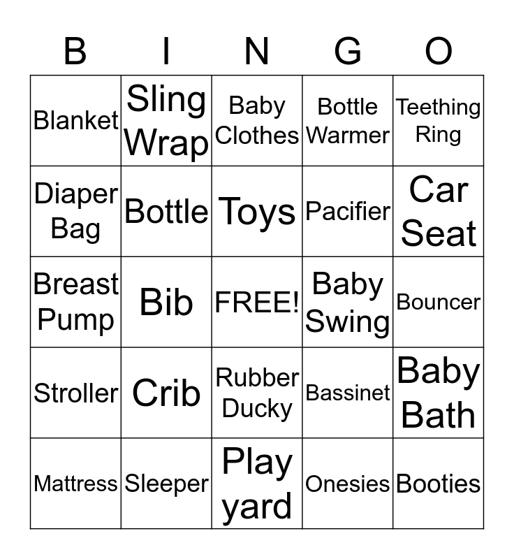 This bingo card has a free space and 24 words: Crib, Sleeper, Toys, Mattress, Teething Ring, Blanket, Diaper Bag, Sling Wrap, Baby Swing, Rubber Ducky, Pacifier, Breast Pump, Bassinet, Baby Bath, Bottle, Onesies, Bouncer, Baby Clothes, Car Seat, Bib, Booties, Stroller, Bottle Warmer and Play yard.