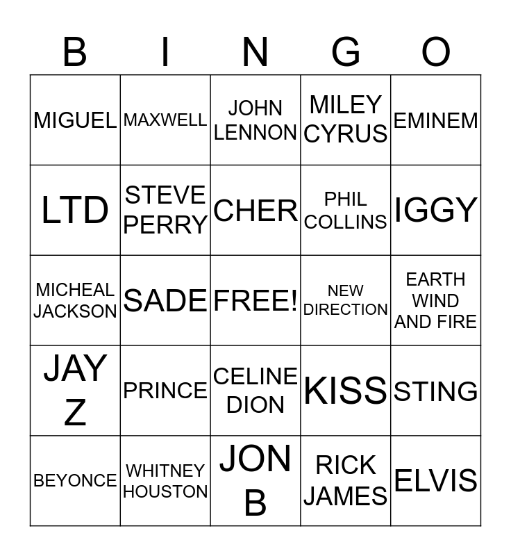 This bingo card has a free space and 24 words: PRINCE, WHITNEY HOUSTON, CHER, BEYONCE, EMINEM, MIGUEL, LTD, MAXWELL, NEW DIRECTION, CELINE DION, PHIL COLLINS, MICHEAL JACKSON, KISS, STING, STEVE PERRY, RICK JAMES, EARTH WIND AND FIRE, JOHN LENNON, IGGY, SADE, ELVIS, JAY Z, MILEY CYRUS and JON B.