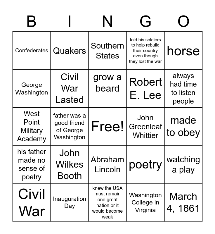 This bingo card has a free space and 24 words: John Wilkes Booth, Inauguration Day, grow a beard, Civil War, horse, Confederates, George Washington, Quakers, John Greenleaf Whittier, Abraham Lincoln, Robert E. Lee, West Point Military Academy, poetry, watching a play, Civil War Lasted, Washington College in Virginia, made to obey, Southern States, always had time to listen people, father was a good friend of George Washington, March 4, 1861, his father made no sense of poetry, told his soldiers to help rebuild their country even though they lost the war and knew the USA must remain one great nation or it would become weak.
