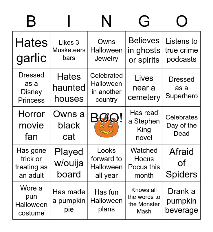 This bingo card has a free space and 24 words: Played w/ouija board, Has made a pumpkin pie, Celebrated Halloween in another country, Wore a pun Halloween costume, Listens to true crime podcasts, Hates garlic, Dressed as a Disney Princess, Likes 3 Musketeers bars, Has read a Stephen King novel, Looks forward to Halloween all year, Lives near a cemetery, Horror movie fan, Watched Hocus Pocus this month, Afraid of Spiders, Hates haunted houses, Knows all the words to the Monster Mash, Celebrates Day of the Dead, Owns Halloween Jewelry, Dressed as a Superhero, Owns a black cat, Drank a pumpkin beverage, Has gone trick or treating as an adult, Believes in ghosts or spirits and Has fun Halloween plans.