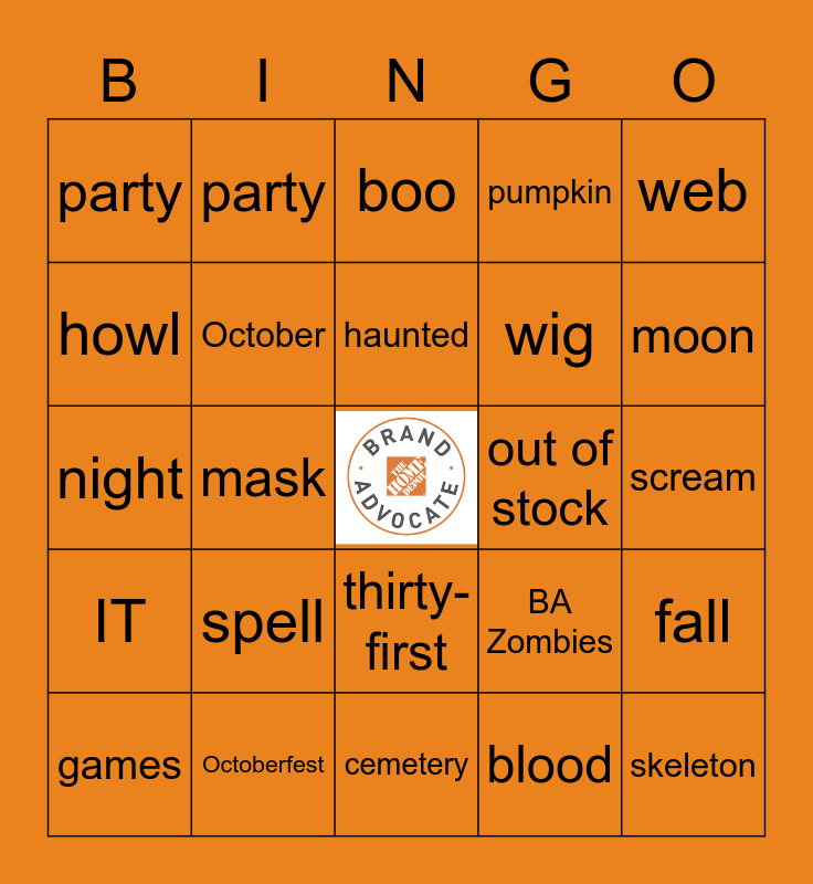 This bingo card has a free space and 74 words: bats, bones, boo, broom, candy, cauldron, costume, fun, games, ghost, goblin, Halloween, haunted, howl, jack-o-lantern, mask, monster, moon, mummy, night, October, party, pumpkin, scary, skeleton, spider, spooky, treat, trick, vampire, web, witch, Hocus Pocus, Addams Family, autumn, blood, broomstick, black cat, cobweb, QBR, cemetery, Octoberfest, Lost Sales, lantern, orange, party, skull, spell, wizard, zombie, RIP, shadow, scream, spell, soldier, spirit, thirty-first, werewolf, warlock, fall, wig, The Grudge, IT, wolf, out of stock, Beetlejuice, Ghostbusters, Paranormal Activity, BA Zombies, Safety, Howling, Candy corn, full moon and Freaky Friday.
