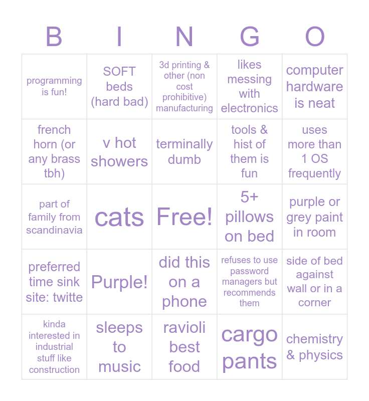 This bingo card has a free space and 24 words: Purple!, sleeps to music, terminally dumb, kinda interested in industrial stuff like construction, computer hardware is neat, programming is fun!, french horn (or any brass tbh), SOFT beds (hard bad), 5+ pillows on bed, did this on a phone, tools & hist of them is fun, part of family from scandinavia, refuses to use password managers but recommends them, side of bed against wall or in a corner, v hot showers, cargo pants, purple or grey paint in room, 3d printing & other (non cost prohibitive) manufacturing, uses more than 1 OS frequently, cats, chemistry & physics, preferred time sink site: twitte, likes messing with electronics and ravioli best food.