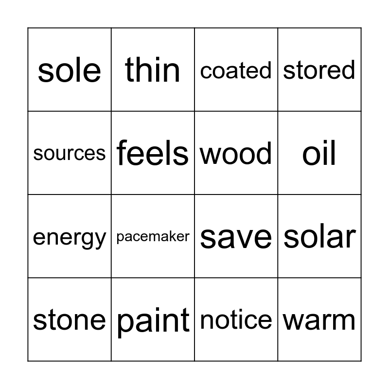 This bingo card has 38 words: hundreds, years, used, wood, coal, gas, oil, heat, sources, energy, solar, stored, stone, notice, feels, warm, plates, coated, black, paint, sole, sunny, pacemaker, electric, machine, beating, heart, steady, aids, racing, case, soap, wires, thin, battery, sensor, save and lives.