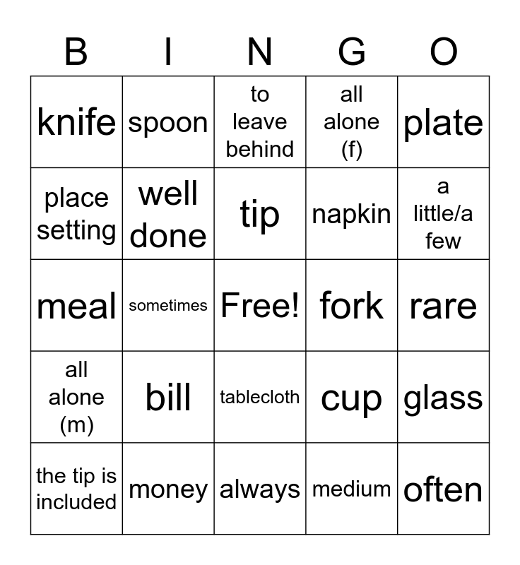 This bingo card has a free space and 24 words: bill, money, tip, the tip is included, plate, knife, place setting, spoon, fork, tablecloth, napkin, meal, cup, glass, well done, medium, rare, to leave behind, a little/a few, sometimes, often, all alone (m), all alone (f) and always.