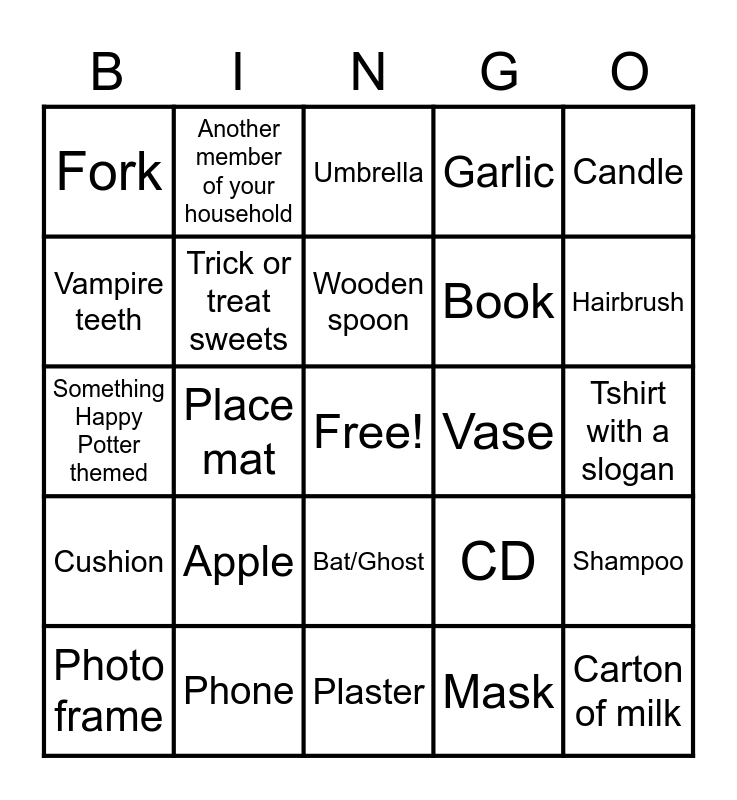 This bingo card has a free space and 35 words: Pumpkin, Broomstick, Fancy dress item, Trick or treat sweets, Bat/Ghost, Garlic, Vampire teeth, Pet, Wooden spoon, Hoover, Something Happy Potter themed, Candle, Something red, Something black, Fork, Vase, Mask, Place mat, Cushion, Carton of milk, CD, Photo frame, Shampoo, Phone, Umbrella, Hairbrush, Jumper, Saucepan, Book, Tshirt with a slogan, Pen, Plaster, Apple, Another member of your household and Hand sanitiser.